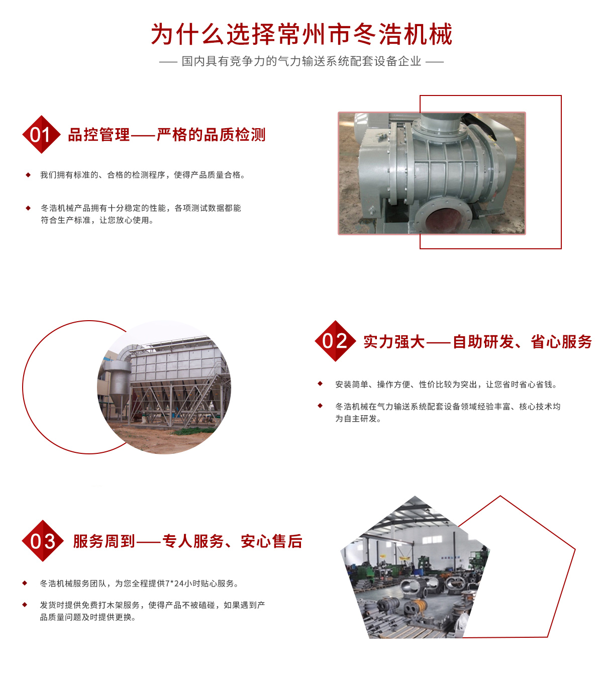 常州市冬浩機械有限公司占地面積5000平方米,擁有一支專業(yè)的科技研發(fā)團隊和配備專業(yè)的生產(chǎn)設(shè)備。專業(yè)致力于氣力輸送系統(tǒng)配套設(shè)備的研發(fā)、生產(chǎn)及銷售。產(chǎn)品在實際應(yīng)用中不斷創(chuàng)新、不斷升級,現(xiàn)已對接實現(xiàn)自動化、智能化、人性化。實踐證明公司生產(chǎn)的吸糧機系列、高溫羅茨風機系列、關(guān)風機系列、氣力輸送設(shè)備系列、特殊工況訂制系列的產(chǎn)品被廣泛運用于石油化工、油脂、化工干燥、除塵、冶金、環(huán)保、電子、煤炭、建筑、電力機械、糧食、飼料等行業(yè)。為解決輸送、搬運等環(huán)節(jié)中節(jié)約大量的人力、財力;從而提高了生產(chǎn)效率。